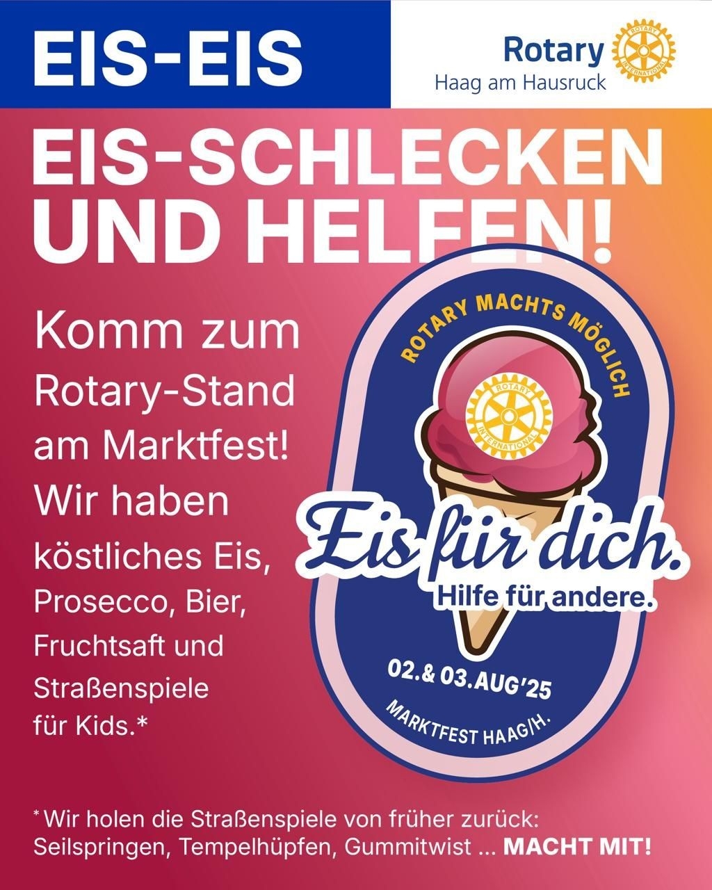 Alle dürfen mitmachen – komm zum Rotary Stand vor der ehemaligen Konditorei Panhölzl!